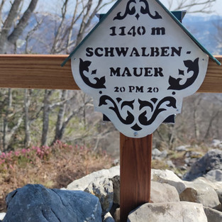 Am Annasberg findet man auch ein kleines Holzkreuz sowie wenn man sich weiter links hält Richtung Schwalbenmauer auch noch ein Erinnerungskreuz. Ich verweile nicht am Gipfel, sondern mache mich sofort auf den Weg zum dritten Gipfel. Ab jetzt sind auf den Bäumen zum Teil wieder schwarze Markierungen zu erkennen, trotzdem orientiere ich mich wieder mit der App. Man folgt nun abwärts dem Pfad runter, bis man zu einer Lichtung kommt und erkennt dann bereits die Schwalbenmauer. Der Anstieg ist ein wenig zum Kraxlen, belohnt wird man aber mit einer tollen Aussicht zum Annasberg, aber auch zum Dürren Eck, dem Gaisberg und dem Schoberstein.